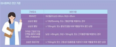´ë»çÁõÈıºÀº ÇÕº´ÁõÀÌ ¹ß»ýÇϱâ Àü¿¡´Â Áõ»óÀÌ ¾ø´Ù. ÇöÀç ±¹³»¿¡¼´Â NCEP(¹Ì±¹ ±¹°¡ ÄÝ·¹½ºÅ×·Ñ ±³À° ÇÁ·Î±×·¥) Áø´Ü ±âÁØ Áߺ¹ºÎºñ¸¸ ±âÁظ¸ Çѱ¹Àο¡ ¸ÂÃç »ç¿ëÇÏ´Â °æ¿ì°¡ ¸¹´Ù. ÀϹÝÀûÀ¸·Î ¾Æ·¡ÀÇ ±âÁØ Áß 3°¡Áö ÀÌ»ó¿¡ ÇØ´çµÇ¸é ´ë»çÁõÈıºÀ¸·Î Á¤ÀÇÇÑ´Ù. ´ë»çÁõÈıº Ä¡·áÀÇ ±Ã±ØÀûÀÎ ¸ñÇ¥´Â ´ç´¢º´, ½É³úÇ÷°üÁúȯ µîÀ» ¿¹¹æÇϰí ÀÌ·Î ÀÎÇÑ »ç¸ÁÀ» ÁÙÀÌ´Â °ÍÀÌ´Ù. ¶Ç ½ÄÀÌ¿ä¹ý, ¿îµ¿¿ä¹ýÀ» Æ÷ÇÔÇÑ »ýȰ½À°ü °³¼±À» ÅëÇØ ÀûÁ¤ üÁßÀ» À¯ÁöÇÏ´Â °ÍÀÌ Áß¿äÇÏ´Ù.