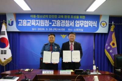 1[µ¿ºÎŸÀÓÁî = ¾çÀçºÀ ±âÀÚ] °íÈï±³À°Áö¿øÃ»(±³À°Àå ±ÇÇü¼±)°ú °íÈï°æÂû¼(°æÂû¼Àå ¾È¹ÎŹ)Àº 2026³â 3¿ù 26ÀÏ Áö¿ª»çȸ ³» Çб³Æø·Â ±ÙÀý°ú ¾Æµ¿¡¤Ã»¼Ò³âÀÇ ¾ÈÀüÇÑ ±³À°È¯°æ Á¶¼ºÀ» À§ÇØ ¾÷¹«Çù¾àÀ» ü°áÇÏ¿´´Ù.