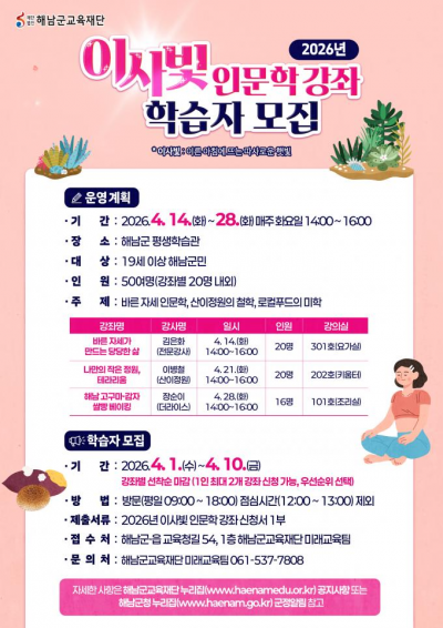 1[µ¿ºÎŸÀÓÁî = ¼ºÁ¤È£ ±âÀÚ] ÇØ³²±º±³À°Àç´ÜÀº 4¿ù 14ÀϺÎÅÍ 28ÀϱîÁö¡®Çس² ÀÌ»çºû Àι®ÇÐ °Á¡¯¸¦ ¿î¿µÇÑ´Ù. ¡®ÀÌ»çºû¡¯Àº ¡®À̸¥ ¾ÆÄ§ µû½ºÇÏ°Ô ºñÃß´Â ÇÞºû¡¯À» ÀǹÌÇÏ¸ç µû¶æÇϰí Ä£±ÙÇÑ Àι®ÇÐÀÇ ºûÀ» ÀüÇÏ´Â ±º¹Î ±³À°°úÁ¤ÀÌ´Ù.